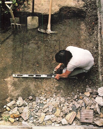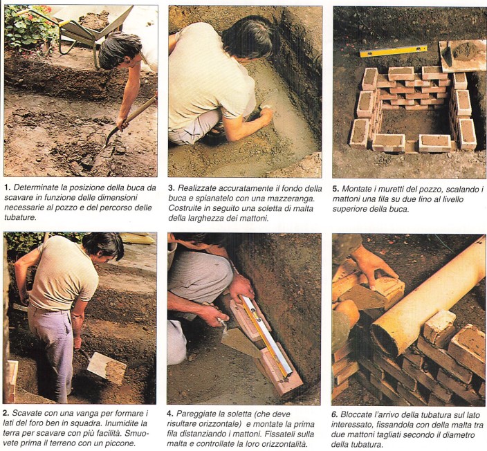 Realizzate accuratamente il fondo della buca e spianatelo con una mazzeranga. Costruite in seguito una soletta di malta della larghezza dei mattoni.